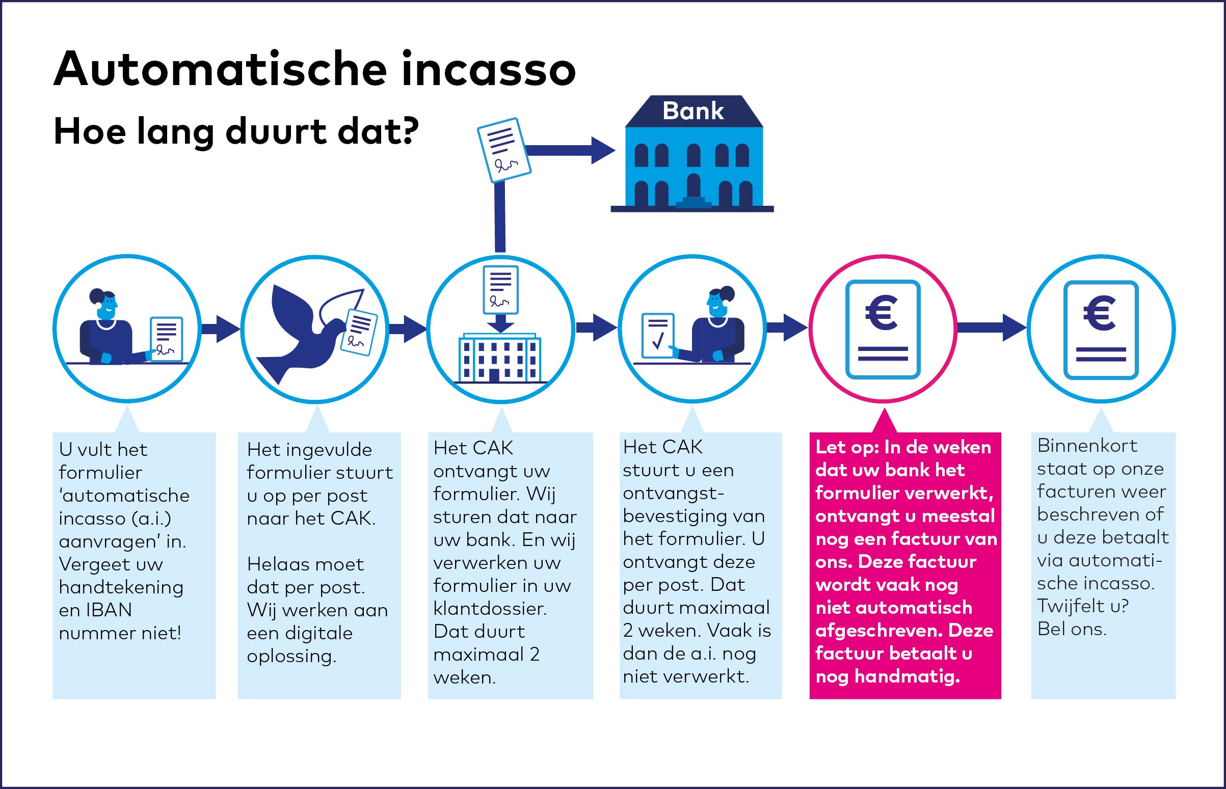 Wilt u facturen van het CAK voortaan automatisch betalen? Via het formulier automatisch betalen (pdf, 172 kB) kunt u automatische incasso aanvragen. Hiermee geeft u ons toestemming om de eigen bijdrage automatisch af te schrijven van uw rekening.
